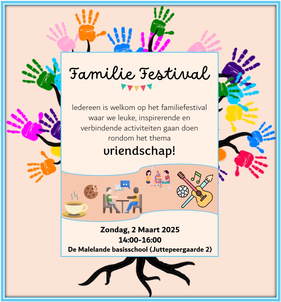 Iedereen is van harte welkom op het Familiefestival, waar we samen leuke, inspirerende en verbindende activiteiten beleven, allemaal rondom het thema Vriendschap!